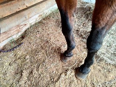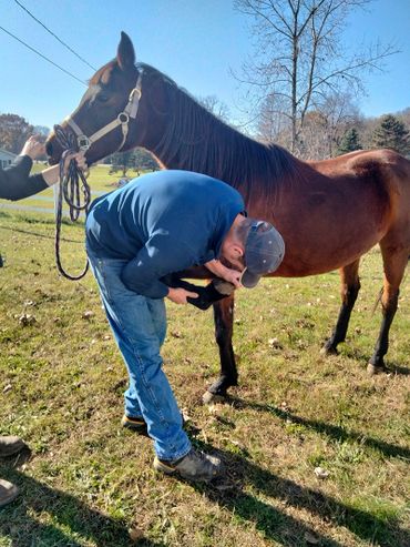 BJ currently has front shoes since she got a little thin soled by the ground being so dry all the time and on that note, she stands for the farrier no problem.