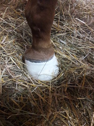 Since her hoof wall on that foot was still kind of soft, the vet put another casting tape around it to insure she won't loose the shoe.