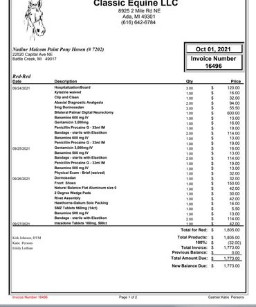 On January 10, 2022 we had her coffin joint and fetlock injected again with IRAP. Unfortunately, that didn't help her soreness and we actually ended up taking her to the clinic 4 days later because she showed some severe lameness and we wanted to make sure there is no infection going on caused by the injections. Luckily, that wasn't the case.