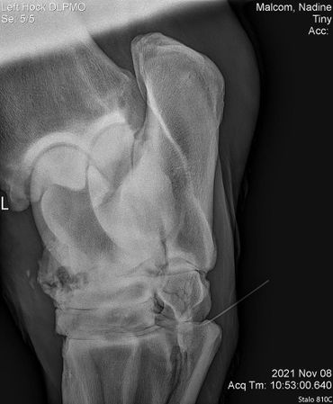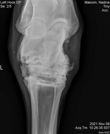 Tiny showed some stiffness in his left hind so we did x-rays on his hock on 11/09/2021. He's got some serious arthritis going on in there so he got injected to make him feel more comfortable especially with winter coming.